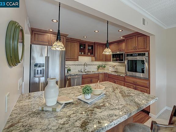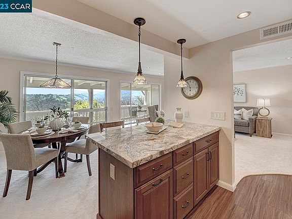 Marvelous Sequoia model in Rossmoor with panoramic views of the Rossmoor valley and Mt. Diablo. Updates to island style kitchen with breakfast base include stone counters with custom tile backsplash, newer stainless-steel appliances, and lighting. Updated bath with custom tile stall shower with bench, new vanity and fixtures, and full-size stackable washer/dryer. Carport is building 606 #5. Other updates too numerous to mention. Don't miss the opportunity to call this wonderful home yours.