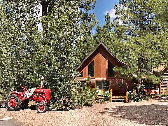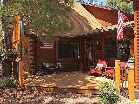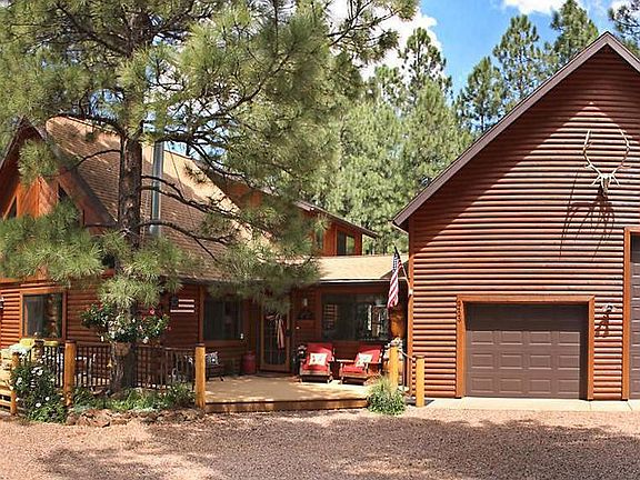 THIS CABIN HAS IT ALL! Location, location,Cheyenne log cabin landscaped large spacious decks cozy warm interior. Remodeling completed in 2005, the kitchen & baths feature knotty elder hickory cabinets with antler pulls, laminated flooring, tile counter tops. Ceiling fans throughout the house and provision were made for A/C if a buyer should want to have one installed. Efficient wood stove in living room as well as a central gas furnace and heated flooring in the upstairs bath. No fuss no muss decking front and back, natural grove of aspen trees, fire pit,ramada, and a garage that most men would die for. 12 x 12 RV door, stairwell to huge upstairs storage loft which could be converted to a mother-in-law quarters or game room PLEASE VIEW VIRTUAL TOUR OMC a small carry back