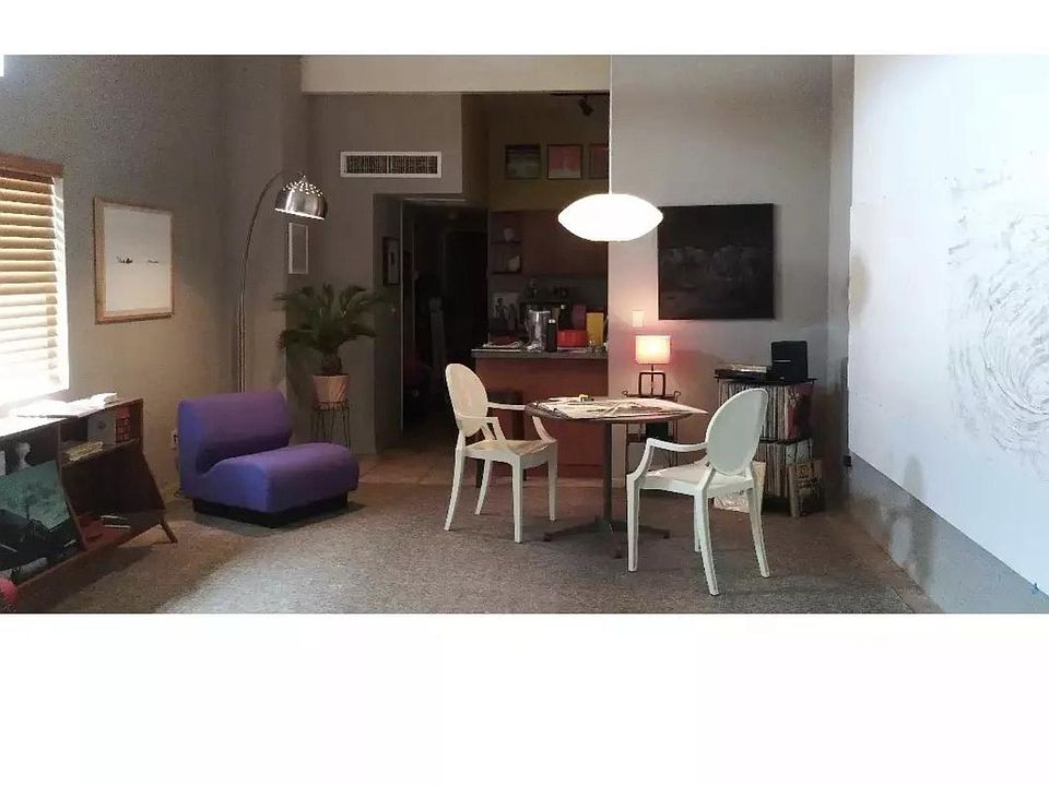 Month to month ONLY STARTING MAY 7... High, lofted ceiling makes this airy and bright one-bedroom the perfect artist's studio residency. 8x16 ft. floating "work wall," rented as furnished MCM throughout. Central location steps from Botanical Garden, gym, supermarket. 15 mins to great hiking. trendy (for Tucson) restaurants close by. UofA is 8 mins.Complex has a pool area and assigned covered parking. Month to month only- condo is for sale. Month-to-month