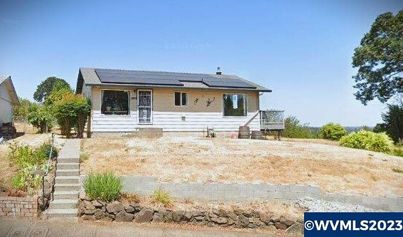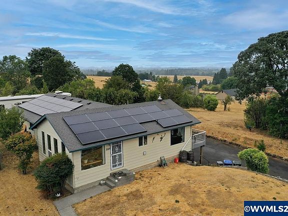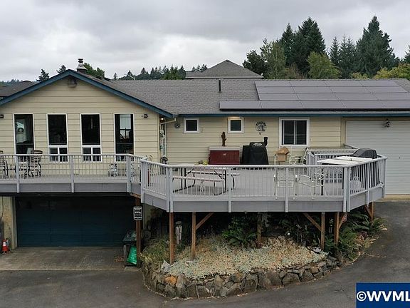Cozy 3/2 home. Corner lot. Amazing views. Keep warm by the Pellet Stove in winter & enjoy reduced power bills with the *paid for* Solar Panels.Large, paved driveway provides plenty of parking, along w/ 4 car garage (currently set up w/ workshop in back) + Additional RV garage. Hot Tub (off Master) on all weather Deck. Two [50amp] RV hookups. RV pad. RV dump. No HOA. Backs up to County lines on 2 sides. Large, unfinished basement area behind water heater with room for storage. BOM no fault of home~