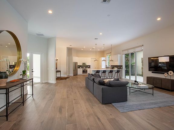 This spectacular, newly remodeled home is a must see! Located in the highly coveted neighborhood of Eagles Landing within Palm Beach Polo, the property boasts 3 bedrooms, 3.5 baths, 2-car garage and a corner-lot location with a pull-through driveway. The luxurious, sophisticated design features wood floors, high-end furniture, lofty ceilings and floor-to-ceiling impact windows that give a welcoming, bright and open feel. The spacious, modern kitchen includes a large center island with bar seating and new high-end, stainless-steel appliances. The professionally designed backyard offers a covered patio, free form pool with a new marble tile deck, outdoor dining area and is surrounded by chic, modern landscaping.