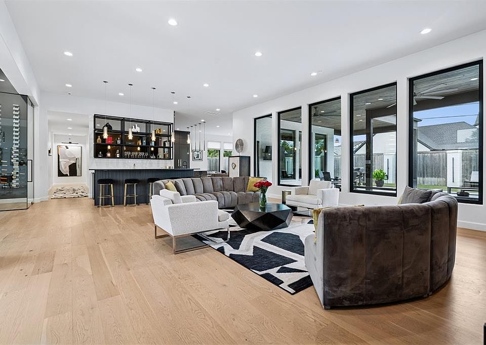 Expansive living spaces feature wide-plank hardwood floors, designer lighting, and walls of windows that fill the home with natural light. The main living area centers around a striking fireplace and flows seamlessly into the chef’s kitchen with a massive island, professional-grade appliances, and floor-to-ceiling cabinetry. A second living area with a full bar and glass-enclosed wine room offers an incredible space for hosting or relaxing.