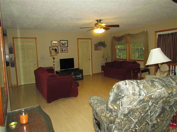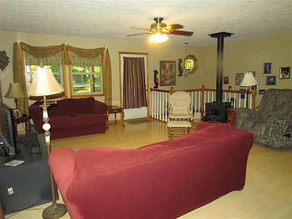 Very nice home in country with private setting. Home sits on 8.79 acres mostly wooded. 4 bedrooms with a office or bonus room. Partially finished basement has den area, bedroom, full bathroom, built in bar & outside entry. Storm shelter under stairwell with concrete wall & attached garage. Large deck 12 by 50 that runs length of home has access doors in the master bedroom and dining area. This home is only 7 miles to town. Lovely kitchen has maple cabinets.