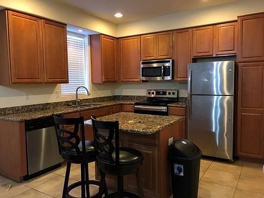 This Contemporary 4 BR 3 1/2 Bath Townhouse is located close to Disney, yet far enough from the highway to be a quiet retreat. The courtyard entry gives it a Modern Mediteranian feel. Inside, the first floor is a modern open concept with Kitchen opening to the living/ dining great room. High ceilings give it a more luxurious ambiance. Surprisingly, it also has a Master Suite which is great for guests or in-laws, Plus a half bath. The second story boasts the Grand Master Suite with balcony. The ensuite full bath includes a Jacuzzi tub. 2 more bedrooms upstairs with shared full bathroom, plus a laundry room with new, full sized washer and dryer! Updates and extras include a garbage disposal, ceiling fans, the washer/dryer, and window blinds. Just bring your clothes and move in. $50.00 Application fee for everyone over 18, Tenant is responsible for Utilities.