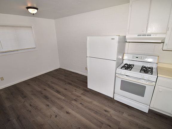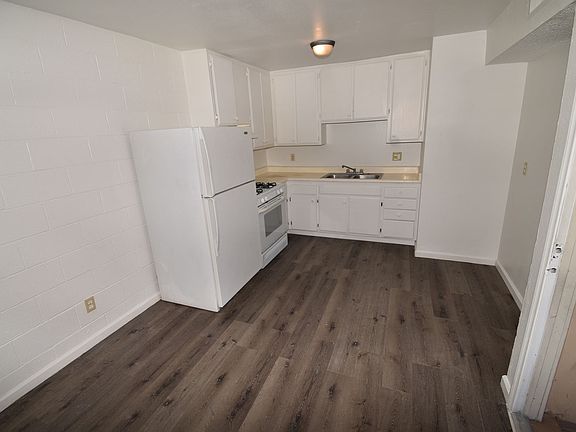 This townhome is a modest, two-story residence with a simple yet functional design. The exterior features beige and brown siding with a slightly recessed entrance for added privacy. The front door is protected by a black wrought iron security gate, and the windows are also secured with decorative iron bars. A tree in front provides some natural shade, casting dappled shadows onto the facade. Inside, the kitchen has a clean, minimalistic aesthetic with white cabinetry and appliances, including a refrigerator, gas stove, and range hood. The countertops are a neutral beige, complementing the white tile backsplash and walls. The flooring is a rich, dark wood laminate, creating a contrast against the lighter walls and cabinets. The open layout allows for efficient use of space, making it ideal for a cozy, functional living environment. We are looking for 650 credit, $3000 gross income and 2 landlord references. The property is getting some love right now with an ETA of 3/15/2025.
