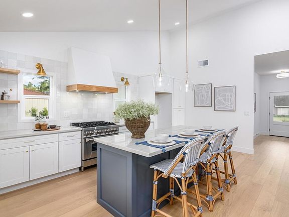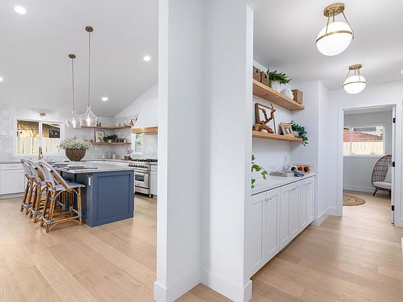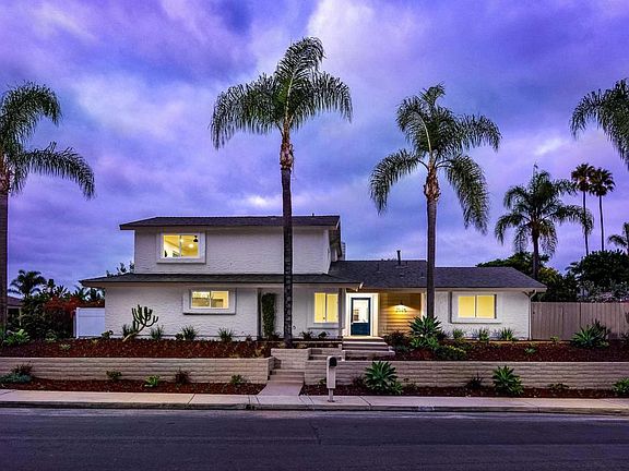 Sitting on a near quarter-acre corner lot on a private, quiet street of South Carlsbad's La Costa neighborhood, this fully remodeled home is just a quick 12 min drive to the surf & sand of North County's long stretch of beaches while also being centrally located between all the attractions of Encinitas/Leucadia, Oceanside & San Marcos. The craftsman home boasts a tasteful blend of modern & coastal accents along with sky high vaulted beamed ceilings & engineered wood flooring throughout its gorgeous open floor plan. Step through the covered porch into a charming formal entryway w/ a built-in wood bench, shiplap feature wall & coat hooks through to your chef's kitchen and up to the large open great room. The gourmet kitchen showcases elegant quartzite natural stone counters, a large eat-in center island, top-of-the-line stainless steel Zline appliances, a spacious separate pantry and an idyllic dutch door out to one of the two paver backyard patios. The expansive living/dining area features a bi-fold accordion glass door out to the large backyard deck overlooking lovely sunsets and one of the backyard's multiple large open lawns. Upstairs are your lavish primary quarters boasting a private balcony w/ scenic views and a luxurious spa-style en-suite bathroom highlighting a huge walk-in shower with an interior soaking tub, a privacy WC room, separate dual sinks & dual spacious walk-in closets w/ built-in shelving. The huge wraparound backyard features multiple extensive lawns, patios and lounging areas perfect for hosting, as well as tall breezy palms and a flourishing tangerine tree ripe for the picking! The home also highlights owned-in-full solar and no HOA. This home is an entertainer's dream and must be seen in person!