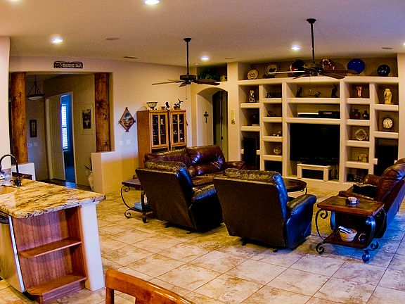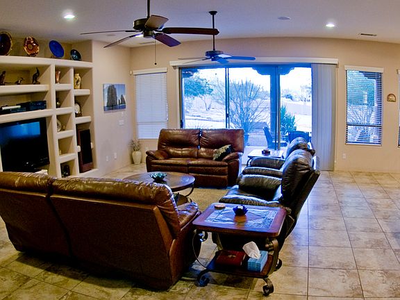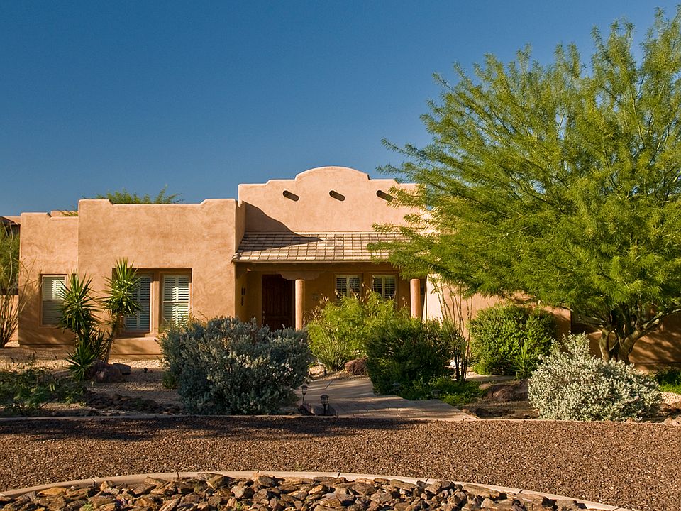 A Territorial single level, custom built home, with all the luxurious finishes that make this a must see home. Beautiful mountain views. Your driving on PAVED roads to get to the home. Using Propane gas to cook and heat the tankless water heater. The doors are 8 ft solid doors with pewter hardware. The kitchen has stainless steel appliances and deep double sink, granite countertops and large pantry. Wood shutters throughout home. Large secondary bedrooms with large closets. There are 3 RV gates and an RV hook up. 4 Car 40'x28'garage with built-in cabinets. Slab parking for additional 6 cars. Large covered patios. The Property behind back block wall is also owned by this owner. Some features include: North/South exposure, mountain views, circular driveway, Walk in master shower, jacuzzi tub, 16 seer HVAC New in 2013, Gas tankless H20 and this is a Traditional home sale.
