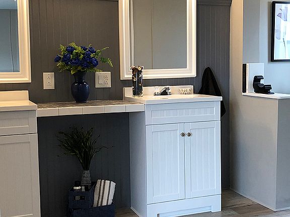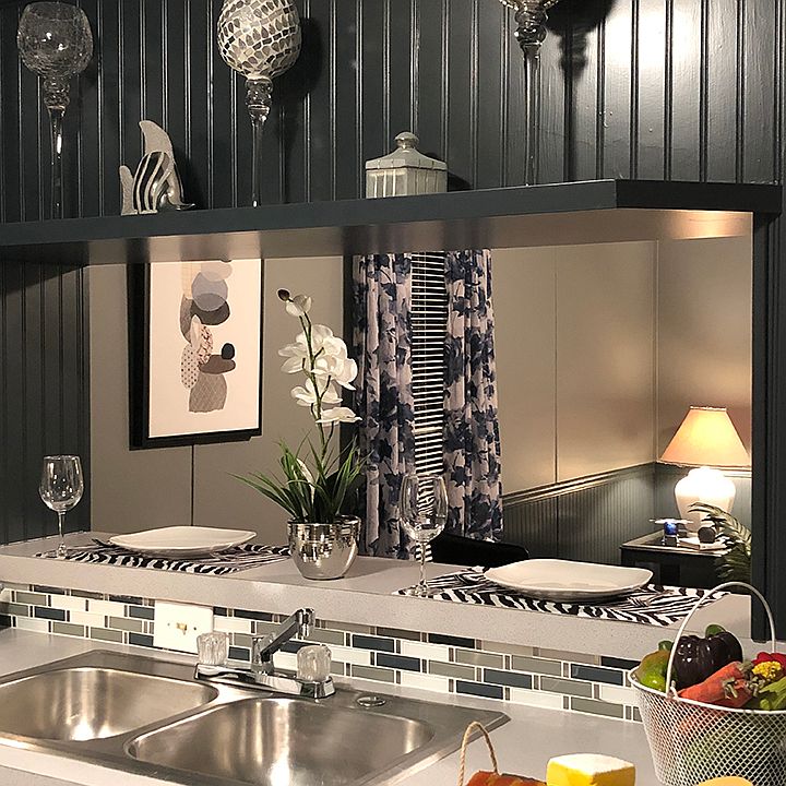 -Classy no Fuss Home- Our wonderful retirement community invites you to view this home, that is intended to remain In Grand Villa Community: This polished 16'x80', three bedroom, two bath home is designed to perfection. Looking for a sophisticated style with clean lines and cool color tones? A design with no strife or bother, just pure comfort and ease of living. Well you have found your perfect home! Wrap yourself in cool colors as you cruise through this one of a kind, polished to perfection, home. Starting with the open living room, you will notice the richly colored B-Board in a deep Prussian blue as it contrast against the soft Smoky grey painted walls creating the illusion of even greater space. Looking into the Dining/Kitchen area you note the Prussian blue has also been artfully applied to the cabinetry which beautifully enhances the unique tile backsplash. The large dining area can comfortably fit a nice sized table, giving plenty of room for guest, as the gorgeous waterproof tri-colored plank flooring eases your mind against a spilled glass of wine or an unfortunately placed platter of spaghetti. The bar height counter separating the kitchen from the living room makes for ease of a quick lunch or snack. Another kitchen feature, always appreciated, is the pantry providing storage as it flanks one side of the refrigerator opening which easily accommodate a large side-by-side. An open utility room is located between the kitchen and master bedroom and is fit with cabinetry over the dryer for out of view storage. A clothes rod, for hanging freshly laundered clothing, has been mounted for your convenience. This area also incorporates the back door. The master bedroom is nice sized, making easy work of furniture placement and will accommodate a king size bed. This room also features an extremely large walk-in closet. The master bathroom has been completely remodeled with a new tub and tub surround, new beautiful his and hers vanities with a tiled make-up surface in between. New mirrors, lighting and beautiful plank flooring finish this incredible room. The front bedroom is large and would make a great library or den for a quiet get away space. The third bedroom can be used for an office or guest room. All the interior doors are new with handsome nickel hardware. The ceilings and walls have all been freshly painted and the carpet and floating plank floors are all new. The porch has two sets of steps for easy access to the large concrete patio, new skirting was installed and the roof has been sealed. This is a 1996 home who’s interior is completely new. This home is located in, and is intended to stay in Grand Villa Community. Grand Villa is a quiet retirement community, the only one of it's kind, in Springfield, Missouri! Lot rent here starts at $295 a month for 2 people and includes your water, sewer & trash. Scroll down for a link to a video tour of this home.