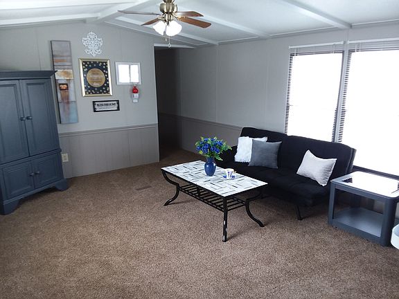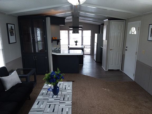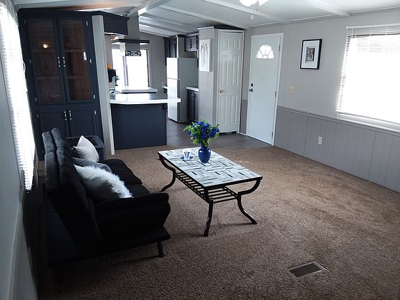 Love the idea of a tiny house? Well, here is the next best thing. This cozy one-of-a-kind 14' x 70' home will have you smiling ear to ear when you walk in. The beautiful kitchen is set at the front of the home which allows for an oversized bay window which opens up and expands the space in this incredible kitchen. What a wonderful way to start your morning, sitting in front of the bay window, with your cup of coffee, peacefully watching the world go by. Rich, deep, midnight blue painted cabinets are set off by perfectly matching glass tiles accented with nickel overlay pieces setting off the cabinet hardware beautifully. This wonderful kitchen is roomy with a lit island work area, many cabinets, a space for your computer/office and more. Fortunately, this "tiny house" kitchen has plenty of room for you to invite your friends and relatives over for holidays and other special occasions. White beams accentuate the vaulted ceiling in the living room and kitchen area opening up these rooms and contrasting exquisitely with the Woodland Colonial Gray walls. The living room has nice sized windows allowing plenty of light to stream in brightening this lovely room. The wainscoting gives nice dimension to the space with its deep tone allowing the lighter toned upper walls to expand the room. The room is laid out in a way that brings ease in arranging your furniture. Down the hallway is the second bedroom which has been freshly painted and would be a great exercise space. The utility area with a washer/dryer hook-up and overhead cabinets is conveniently located outside the master bedroom. The bathroom is nice sized with a new tub and tub surround. Beautiful glass tiles in grays and blues set off the vanity area giving this room an elegant look. The master bedroom is open with a large spacious closet and the home comes with a newer hot water heater. The home's exterior has been painted a charming Chalky Blue and Whirlwind Gray and as soon as weather permits the roof will be coated to ensure no leaking. The home comes with a covered deck central heat/air and a metal shed making it this year's treasure home. All of this for only $18,900. **Get approved today with a credit score of 600 or better! Down payment as low as $1,800.00 or with payments starting at $315.00 a month-wac **The home is nestled in a quiet retirement (55+) community with lot rent starting at $280/month for 2 people. Lot rent includes water, sewer and trash. This home is to remain in the retirement community, it is not available to be moved out.