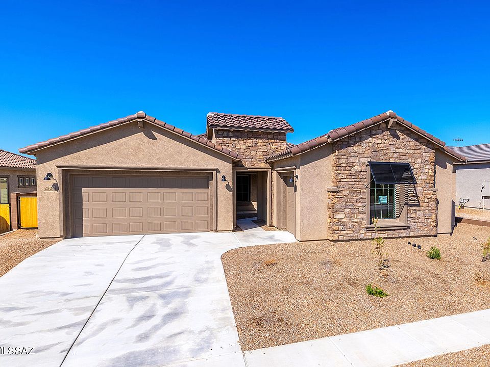 Move-in ready. This stunning 3,241 sq. ft. home in Oro Valley, located near the end of a cul-de-sac, features an elegant stone facade and inviting front courtyard. The spacious interior includes a grand gathering room with a 4-panel sliding glass door and a gourmet kitchen with top-tier KitchenAid appliances, pull-out cabinets, and soft-close features. The private suite in Bedroom 5 and the versatile flex room offer tailored living options. Upgraded electrical, a tankless water heater, and pre-plumbed laundry sink complete this exceptional home.