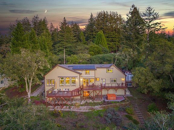 Move-in ready, 3-bedroom 4-bathroom home with beautiful views from all living spaces, modern amenities and fantastic outdoor living! High living room windows provide striking west facing views in most living areas. Luxurious main-floor master suite features a sitting room with cozy 2-way gas fireplace, spa-like master bath with heated floor, large tub, and glass-enclosed shower. The gourmet kitchen opens into the living room and expansive decks for indoor-outdoor living. Relax in your home theater or wine cellar and tasting room! The artfully designed Stand alone bar opens to a lower stone patio through large & beautiful double doors. Additional features: - Top floor sitting area provides an alternate TV area or just a quiet space - Garage Workshop built in cabinets, closet storage; opens to backyard - Solar Power owned by seller, generator with auto start - Short drive to the wonderful Summit Store grocery, hiking, mountain biking or award-winning Top Los Gatos Schools