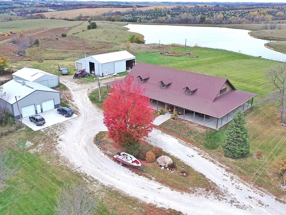 Country Home For Sale in Southern Iowa with Lake and Wildlife on 40-acres m/l 2527 270th Avenue Mount Ayr, Iowa *This property is also being offered in two separate tracts. If you are interested in just the home and buildings you can buy just that, or if you are wanting just the land and lake you can buy it separately. House, buildings, and 9-acres m/l is currently listed at $599,000. The remaining 31-acres that includes the lake is currently listed at $200,000. You'll love this southern-styled country home nestled in the peaceful rural setting of Ringgold County, located close to the border in southern Iowa. Come take a look at the open kitchen plan and the breathtaking views from the wrap-around porch. Catch a glimpse of the deer and wildlife that come close to the porch or catch some big fish from the lake while boating. This 5,700 square foot, 4-bedroom, 3-bathroom home sits on 9.89 acres with an additional 31-acre m/l farm included with a 15-acre m/l lake stocked with bass, crappie, bluegill and channel catfish. This is a solid home that was well built! All walls are built with Insulated Concrete Forms, and the walls are 1' wide. This property offers so many unique features! Who can resist the full and complete wrap-around porch that makes an integral addition to this gorgeous home! Imagine catching a beautiful southern Iowa sunrise while enjoying the summer breeze or relaxing in the evenings and watching the sun set on the other side of this beautiful home. This wrap-around porch wraps all the way around the house that makes the most of the scenery by offering multiple views of the great outdoors. The shade over the porch allows the opportunity to entertain rain or shine and will also help cut down on your summer cooling costs. Gather with friends and family or just relax quietly in this peaceful setting in your rocking chair at the end of a long hot day. Top features buyers are looking for when buying a home in 2020 is space and location with open floor plans, storage and kid-friendly design. This property meets all these expectations and so much more! Another top unique feature of this lovely home is the large kitchen with a 10' island and also has a tremendous amount of cabinets and storage areas. The tall ceilings and the large room inclusive of the dining area makes a cozy environment to host large family gatherings. The great living room is designed with wood ceiling beams and has a beautiful view and a warm, inviting fireplace. Imagine cuddling up to a cozy fireplace with a good book. The master bedroom has a large walk-thru closet connecting it to an adjoining bedroom. The master bath was carefully crafted with tile floor and walls and includes a corner tub and a charming built-in walk-in shower. The home is adorned with many intricate details with hand-made wood trim that was made on sight with wide baseboards and detailed door and window wraps. The wide-open staircase leads to the second floor which makes for a great get away for company or a game area. The barn style doors to all the attic closets add charm to this country home. Every space in this home has been made usable. Also included with the 9.89-acre parcel is two silos, a barn, a pole building and a shop/garage which all have concrete floors. Lots of buildings for many possibilities. This is a MUST-SEE property to appreciate all the intricate detail and layout of the house and get a feel and appreciation for all this property has to offer! Properties like this have become a hot commodity so don't wait! Provide your pre-approval letter from your lender and set up your showing today!
