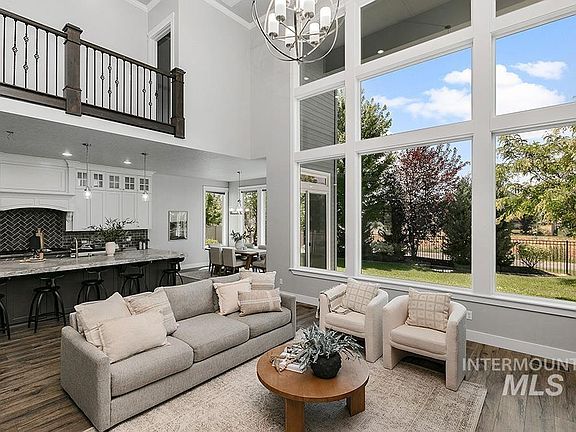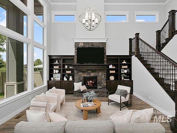 Luxury living meets remarkable scale in the Meridian's established Tuscany community! Sitting at 4300+ square feet, this elegant Craftsman residence perfectly blends sophistication, playfulness, and luxurious daily function. Sky-high double-story ceilings tower in the living room lined with architectural windows and an impressive stacked-stone fireplace at the heart. The gourmet kitchen is anchored by an oversized island that allows you to cook, eat, and use the space freely, as ceiling-height cabinetry, gorgeous honed marble countertops, and stylish backsplash create a magazine-worthy scene. Premier stainless steel appliances include a commercial-style gas range & French door refrigerator, a built-in microwave, and a panelized vent hood. The oversized primary wing on the main level features a luxurious en suite bathroom and a large walk-in closet with nearby laundry access.