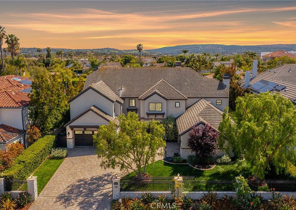 Ideally situated on a completely flat lot, quiet cul-de-sac, this exceptional custom-built Nellie Gail Ranch estate combines luxury & elegance with attention to detail throughout! Spanning almost 5,000 sq/ft of quality and sophistication, the home offers 5 bedrooms & 4 1/2 baths and 2 main floor offices. Sensational curb appeal with gated motor court entices you into an entry with soaring ceilings & an abundance of natural light. The gracious open floorplan boasts a splendid foyer which leads to the large living room, dining, office & gourmet kitchen that opens a large inviting family room. Custom chef's kitchen features a large center island, breakfast nook and overlooks the backyard. The en-suite downstairs bedroom is ideal for guests. Ascend the stairwell into the spacious primary-retreat that features high ceilings, retreat area with two-way fireplace & roomy balcony with private staircase to the backyard. The luxurious bath affords a relaxing tub, walk-in shower, dual vanities and a large walk-in closet further enrich. The 2nd floor also offers three additional bedrooms, one of which could be used as a bonus room. Outside, discover a spacious yard with a beautiful pool and spa perfect for quality outdoor family living and extravagant gatherings. Landscaped with mature fruit trees including apricot, lemon, peach, nectarine and cherry. Additional amenities include a main floor laundry & mudroom, 2 double direct access garages (for 4 cars) and paid solar.