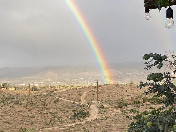 A 5 acre hilltop ranch oasis with views. This property features 3 bedrooms and 2 3/4 bath. The landscaping is gorgeous and the walk to the front door will have you feeling like you are walking through a beautiful green forest. When you enter the double doors of the home you walk into a welcoming front room/dining area. It has a wood burning stove as the center piece and wood flooring. The room has large glass windows where you can view the beautiful greenery of the wisteria. The living room is a large room with a fireplace surrounded by rustic wood paneling. Large enough for the big family. When going through the kitchen you will see wood cabinets and corian countertops. It has a pantry and an area for your regular fridge and an area for a wine or extra fridge. There is a freestanding island that has a cabinet and drawers for storage and spices. The 3/4 is located in the hallways and is part of the laundry room. The Primary bedroom has beautiful antique wood closet doors and Spanish tile that was custom made with a few little animal foot prints. It has high wood beamed ceilings and windows for lots of light. The 2nd bedroom has a built in double armoire with area for a TV and lots of drawer space. The 2nd bedroom also has its own bathroom with dual sinks. The property has a barn surrounded by corral panels, large dog run, shed with full electric and a cabin on the lower part of the property. The patio view is of the city lights.