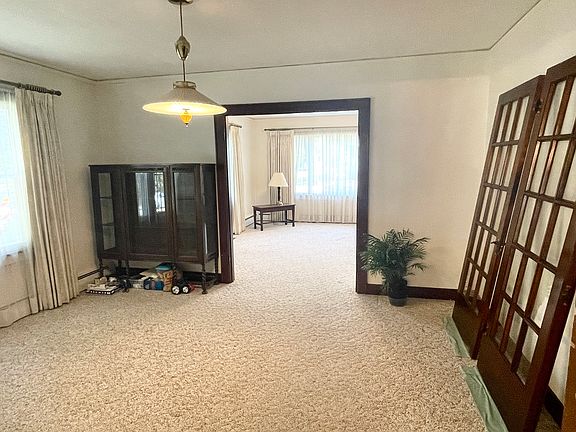 Spacious and clean! This Peru home has 3 bedrooms, 1 bath, a 2 car detached garage on a large corner lot and is priced below appraised amount! A versatile closed-in front porch provides beautiful French door access to the main living space. Living and dining rooms offer beautiful large windows and their original French doors are provided. Hardwood flooring under the carpeting on main level. The eat-in kitchen has table space and a large double window above the sink. The upper level houses a large bedroom, walk-in closet and dormer storage. The full basement is well lit with plenty of windows and includes laundry area and much storage. Roof less than 6 years old, dishwasher 2021, washer 2021, water heater 2019, upper level furnace and A/C 2017. Zoned R3 single or two family residential.