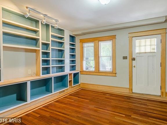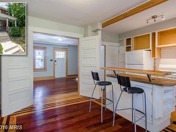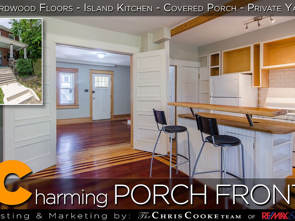 CHARMING PORCH FRONT ROWHOME WITH TONS OF DISTINCTIVE DETAILS! Main level hardwood floors with inlays, spacious living room with built-in bookcases, separate dining area, island kitchen w/ wood counters, upper level with 3 bedrooms with hardwood floors and 1 full bath, full basement with laundry & storage space, rear patio, and private fenced yard!