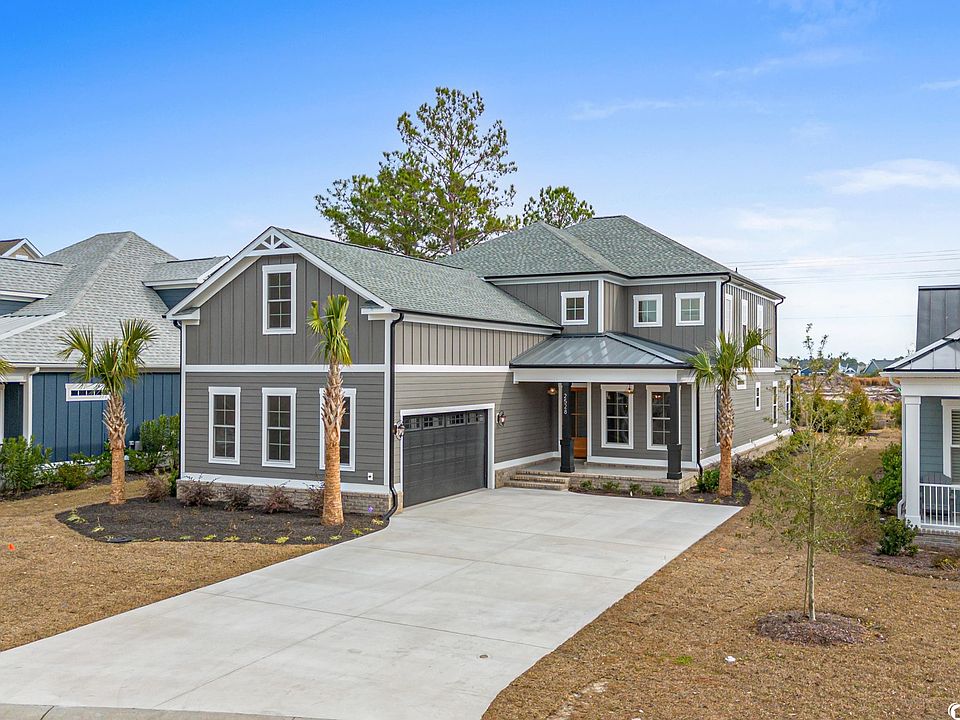 Discover your dream home at 2528 Lavender Lane, located in the coveted Waterbridge subdivision of Carolina Forest, one of Myrtle Beach's fastest-growing communities. Spanning a generous 4,098 heated square feet with an overall footprint of 5,023 square feet, this newly constructed residence boasts a blend of modern luxury and classic Southern charm. The first floor offers a grand master suite complemented by beam ceilings, and a lavish bathroom featuring a floor-to-ceiling tiled shower. Additionally, you'll find another bedroom, an office, and an expansive kitchen equipped with custom cabinets, a specialized range hood, a wall oven with convection microwave, a slide-in range with a gas cooktop, and a second electric stove. An adjoining bar area with a beverage center completes this culinary haven. Take the journey upstairs to discover three more bedrooms, a flexible bonus room, a second office, and ample attic storage. With engineered hardwood floors running throughout and tile in all wet areas, the home exudes quality and style. A separate, spacious laundry room with plentiful cabinets and an oversized two-car garage with epoxy flooring add to the convenience. The community itself is a wonder to behold. Waterbridge offers residents a myriad of world-class amenities, from South Carolina's second-largest residential pool to lazy rivers, tennis and volleyball courts, a pickleball court, a well-equipped gym, and a 60-acre freshwater lake. Don't miss out on this unparalleled living experience in the heart of Myrtle Beach. Welcome to your forever home at 2528 Lavender Lane.