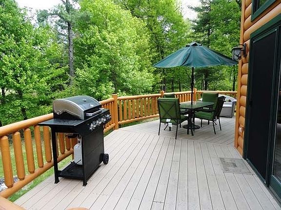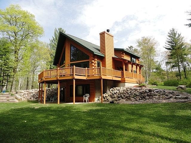 NORTHWOODS GEM! Custom built in 2003, this Northwoods style 3 bedroom 2 bath home has log siding with a covered porch and wrap around deck finished with composite decking and log railings. Open concept living area has T&G ceilings, inviting fieldstone fireplace & wall of windows for wonderful wooded privacy views. Kitchen has raised panel oak cabinets, glass back splash & large island housing the dishwasher. Main level master suite with walk thru closet, Jacuzzi bathtub, separate shower, & double sinks. 2nd floor has sitting area, 2 bedrooms, full bath & open loft overlooking the great room. Finished lower level walk out has 9' ceilings, in floor heat, exercise/bonus room and rec area with kitchenette & 3rd full bath. Other amenities:30 year shingles, solid wood raised panel doors, attached insulated 24x26 garage with in floor heat, central air, drilled well, and conventional septic. Logs recently restained. CERTIFIED PRE-OWNED HOME offers peace of mind when purchasing this home!
