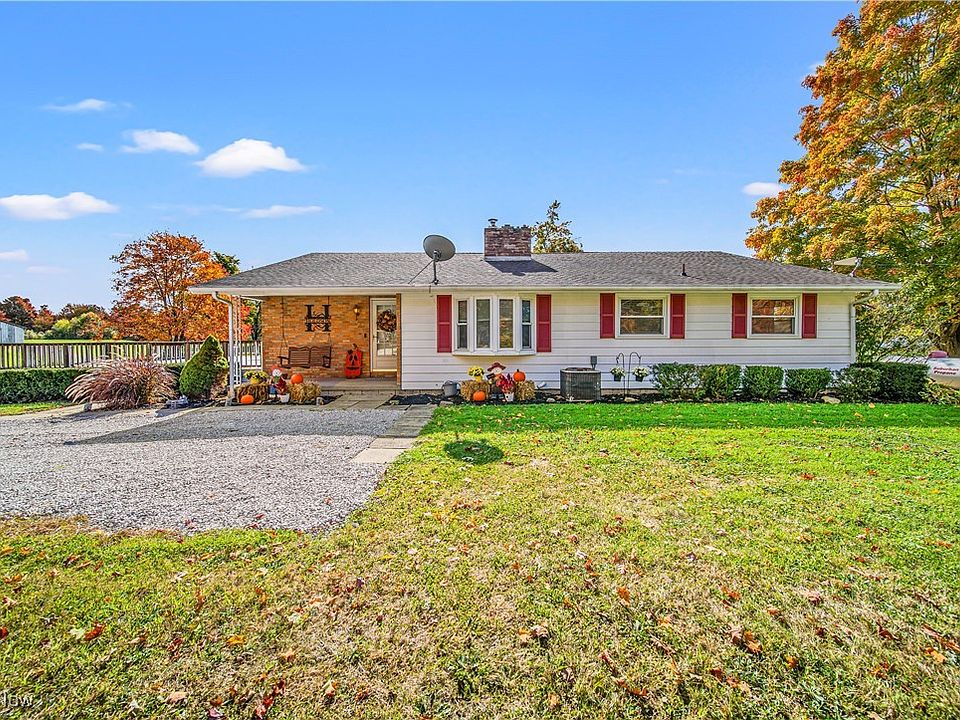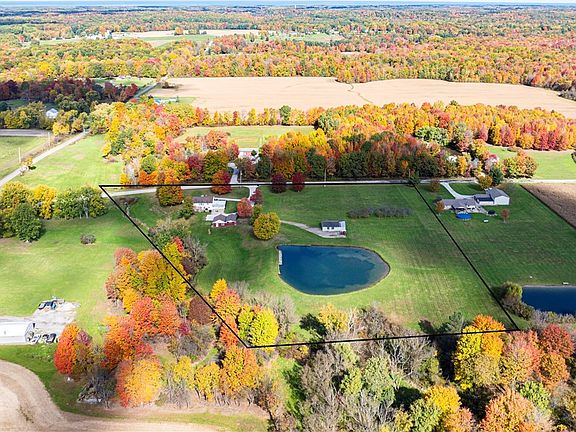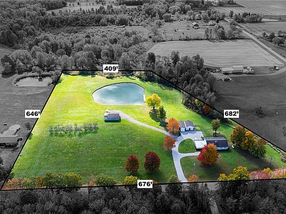 This stunning 3-bedroom, 2-bath ranch home sits on nearly 8 acres offering both comfort and modern updates. With plenty of space for outdoor and indoor enjoyment. The main living area features a huge living room with a cozy stone-wall double-sided fireplace connecting the living room and den. The dining room and den feature beautiful original hardwood floors. The main level also features 3 generously sized bedrooms, a main bathroom and an updated kitchen complete with newer stainless steel appliances, The finished walk-out basement boasts a huge entertainment area with a full kitchen and bar, complete with new plumbing and new light fixtures. Step outside onto a concrete patio surrounded by a serene, creek front outdoor setting. The property also features multiple outbuildings for storage or hobbies and a peaceful pond for relaxing. This home offers the perfect blend of indoor entertainment and outdoor serenity. Schedule your showing today!