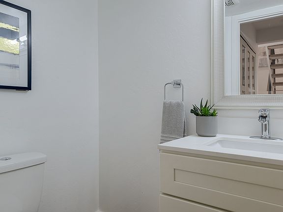 Rarely available, freestanding chalet style townhome with no attached common walls. Prime location in the back of a well maintained & desirable complex. Tastefully updated with no wasted space. Large inviting living room w/new floors & sliding glass doors to a private patio/backyard. Spacious kitchen w/new quartz countertops & stainless steel appliances that opens to a separate dining area. Recessed lighting. Full size w/d & updated 1/2 bath on the main level. Generous sized bedrooms w/vaulted ceilings & wall of closets w/new wood framed glass doors plus sunny upper balcony off the front bedroom. New carpeting. Remodeled full bathroom w/shower over tub, custom tile surround, shampoo niche & swinging glass door. Separate dressing area. Additional features include dual pane windows & sliders, new flooring, baseboard, closet doors & interior paint throughout. 1 covered carport space w/extra storage plus 1 assigned space.