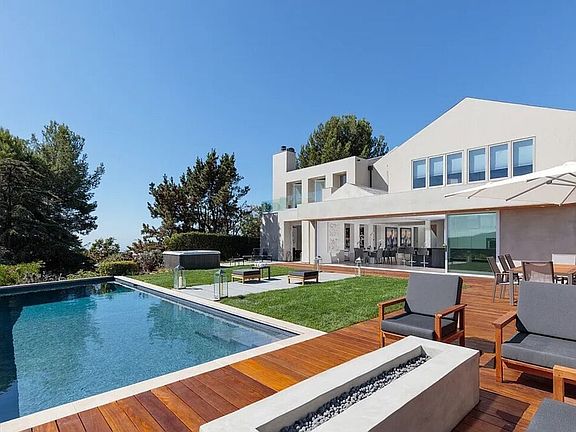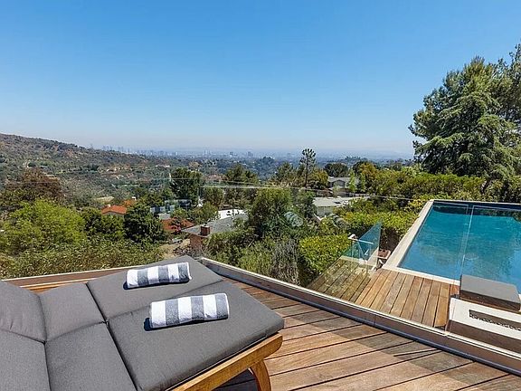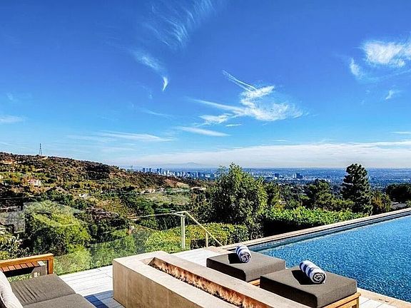 Fully furnished 5 bd + 5 ba Architectural home located at top of Brentwood Hills. Remarkably designed home has effortless flow. Unobstructed views of the hills & city. Partial ocean views from master suite & upper deck. Main level offers entry with baby grand piano and soaring ceilings that lead to open living/dining areas. Italian designer kitchen is an entertainer's dream w/ top-of-the-line appliances. Back of the house reveals a beautiful yard with sparkling pool & fire pit. Main level also includes a family room, powder room & guest suite. Master suite has wall-to-wall windows with amazing views, a spacious terrace & a luxurious bathroom & walk-in closet. There are 3 additional generous bedroom suites upstairs. Other features include big screen TV, wireless sound system & Tesla electric car charger. 1.5 blocks to local hiking trail.