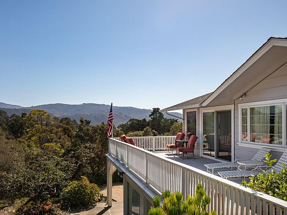 Rancho Rio Vista neighborhood. "On Top of the World" near the end of a quiet cul de sac is a wonderful home with spectacular views of the ocean / Point Lobos and the Palo Corona and Preserve hills. This family- ranch style home (3,839 square feet) offers open beam ceilings in the living room, a sun drenched family room, a spacious and modern kitchen, 4 bedrooms (one of which is separate as an apartment) and 2 large bedrooms on the lower level. With spacious decks and patios you will always enjoy looking beyond to the south and west. Rancho Rio Vista is a very convenient location to the Carmel schools, shopping at the mouth of the valley, and practically endless hiking trails.