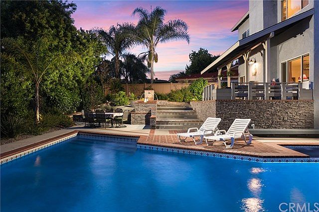 This stunning custom pool home with potentially 6 bedrooms and 4 bathrooms including dual master suites is a once-in-a-lifetime home. A spacious entertainers' palace that is every buyers' dream; a completely high end remodeled home. Upgraded plumbing, electric, windows, doors, drywall, kitchens and bathrooms. You name it, it's been done. The chef's dream kitchen has a huge island, custom soft close cabinets, crown moldings, slab granite counters and farmhouse sink. The kitchen opens to a welcoming great room which features a lovely ornate fireplace, custom blinds, ceiling fans, herringbone tile flooring and views of the yard. Upstairs are three oversized bedrooms with cherry hardwood floors, highly upgraded bathrooms, fans and an upstairs laundry room. The master wing is private from the rest of the house and has high ceilings, remote controlled gas fireplace, sitting area, two closets one of which is a walk-in and its own retreat or office. The huge master bathroom is complete with porcelain tile flooring, Italian granite countertops, dual sinks, a jacuzzi tub, separate seamless glass shower and views of Saddleback Mountain. From almost anywhere in the house open the dual pane Low-e windows and enjoy the sound of water cascading down a custom fountain and the sight of the amazing backyard complete with Pebble Tec pool, spa, flowers, rose bushes, and fruit trees. Walk to parks, the library, community center and award-winning schools. No HOA, or Mello-Roos, super low tax rate.