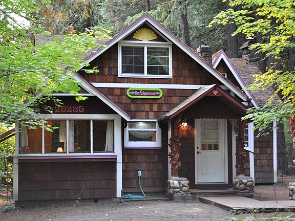 Desirable 2 level cabin located on a 0.42 acre wooded lot w/storybook gingerbread accents plus versatile detached 264 SF guest house/studio-Kitchen incl all appliances, laminate floor & opens to the light/bright dining room-Vaulted great room incl vintage stone fireplace w/timber mantle set in barn wood accented wall, ceiling fan & porch access-Vaulted master bedroom w/french door access to view balcony-Main level bonus room, updated bath & utility room-Recent decking, carpets & laminate floors!