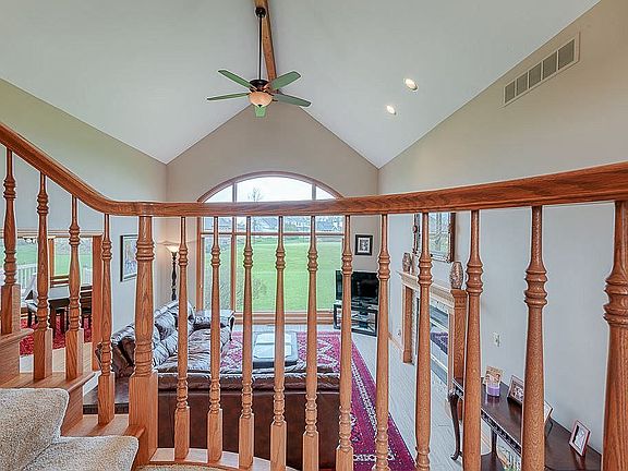Beautiful 4 bedroom home built by Klopfenstein on the golf course in Autumn Ridge. Pics were taken in summertime. Available to see on short notice. The two-story foyer opens up to the great room with a gas fireplace and fantastic views overlooking the tee for hole # 3. Large master suite on the main level. Granite counters and center island in the roomy kitchen with lots of cabinets, and large family eating area with access to the back yard deck. Main floor laundry room off kitchen. Maytag washer and dryer plus kitchen appliances stay. Formal dining room. Den with French doors and built-in cabinets. Three bedrooms up and another full bath. All bedrooms are generous sizes with lots of closet space. Over 1000 finished SqFt of family area in the basement with 3rd full bath, an extra room with closet, plus a storage/utility/exercise room. New furnace and A/C. Three car garage. If you like the added measure of radon mitigation, it is already installed. The low Autumn Ridge Community Association fee includes pool and tennis courts. Golf fees per round or memberships and family plans are available.