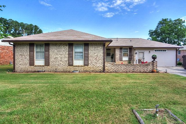 Front courtyard introduces a beautifully updated 3BR-2BA Brick ranch with a new roof. Gleaming laminate floor throughout dine-in kitchen and living room. Remodeled kitchen has recessed lighting, sizable island, beautiful solid surface counters, tile backsplash, new cabinets, and stainless steel appliances to include a gas range, dishwasher, and built-in microwave. Large dining area with built-in china cabinet. Spacious living room features crown molding and picture windows overlooking back yard. All three bedrooms have ceiling fans and ample closets. Owner's bedroom has a private, full bath with large vanity, tile floors, and tiled tub surround. Second full bath features tub/shower combo. Two car garage has been enclosed and an AC unit & fans have been added for additional comfort. Provides a great workshop or den space. Spacious laundry room. A flat, fenced-in back yard boasts a storage building and basketball goal. Must see the lovely updates!