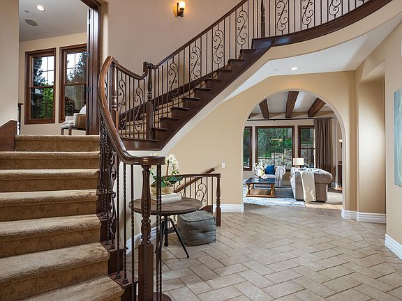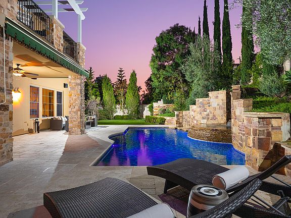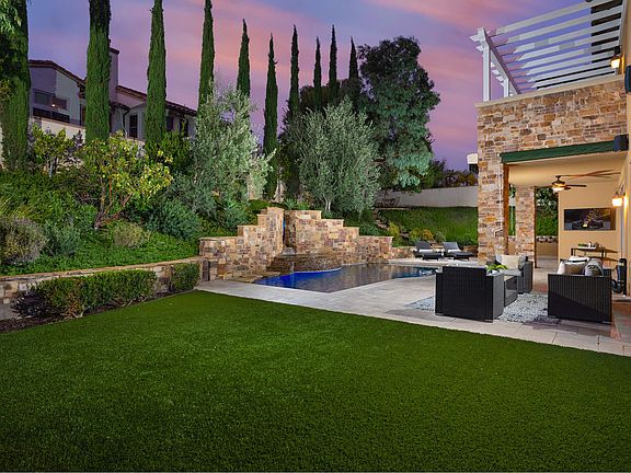 Stunning, Tuscan-inspired luxury in Nellie Gail Ranch! This entertainers dream estate features 5 fully en-suite bedrooms including a detached guest casita, indulgent amenities and designer finishes, and prime outdoor living with a saltwater pool and spa, waterfalls, outdoor kitchen and more! Relax with guests in the courtyard with a fireplace and fountain, play on the bocce ball court and low-maintenance turf lawn, cook in the fully equipped outdoor kitchen with Viking appliances, and dine under the stars in multiple patio areas! A dramatic spiral foyer leads to a home office, movie room with wine fridge and built-ins, and formal living and dining pouring with natural light. The open-concept family room and gourmet kitchen showcases a fireplace, large granite island, walk-in pantry and butlers pantry, and top-of-the-line Sub-Zero and Wolf appliances. After a day of entertaining, retreat upstairs to your generous bedrooms and bonus room, as well as a convenient laundry room on the same level. The luxe primary suite boasts a fireplace, sitting area, private balcony, and decadent dual-vanity bath with a huge 2-sided walk-in closet, oversized shower, soaking tub and makeup vanity. Ceramic tile is displayed throughout the main level, hardwood floors upstairs, and epoxy floors in the 3-car garage with built-ins. Additional amenities include 2 water heaters, 3 HVAC systems, reverse osmosis, water softener and tailored hardscape. A modern masterpiece in Nellie Gail Ranch!