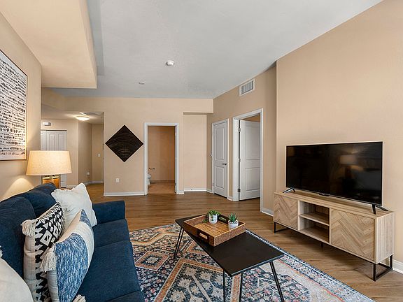 Large dresserLarge smart tvOpen plan living spaceAlternative storage spaceSliding glass doorsSpacious three-door closetComfortable queen size bed