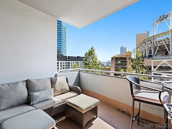 Situated in the vibrant heart of East Village, this expansive 739-square-foot one-bedroom, one-bath Park Terrace residence offers an elevated urban living experience. With soaring 9-foot ceilings and floor-to-ceiling windows, the home is bathed in natural light and showcases captivating west-facing views that span the dazzling city skyline, Coronado Bay Bridge, and the electric atmosphere of Petco Park. The open-concept kitchen is designed for both style and function, featuring sleek granite countertops, stainless steel appliances and generous cabinetry. Luxury vinyl plank flooring adds warmth and sophistication throughout, while the spacious bath offers ample storage and counter space. The full-size, in-unit washer and dryer and central air and heat provide added convenience, and the generous balcony invites you to savor San Diego’s most exciting views from the comfort of your own home. Beyond the residence, Park Terrace elevates lifestyle with an array of premium amenities. The fifth-floor terrace is perfect for entertaining or relaxing—complete with a fire pit, picnic-style seating, and front-row views to concerts and the energy of the ballpark. Residents also enjoy access to a state-of-the-art fitness center and an elegantly landscaped entertainment deck with lounge seating and BBQs. Just four blocks away, the iconic Gaslamp Quarter awaits with its vibrant dining and nightlife, while the nearby Harbor Drive Pedestrian Bridge connects you to the Convention Center, Embarcadero Park, Seaport Village, and ferry access to Coronado. Includes secure gated garage large parking space! This is urban living at its finest—a true must see!