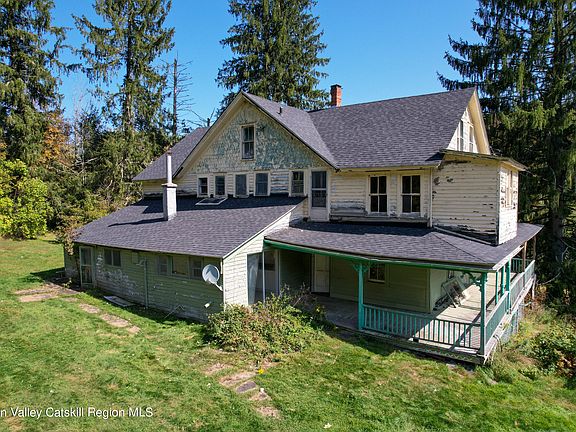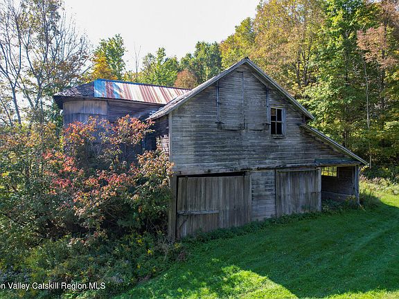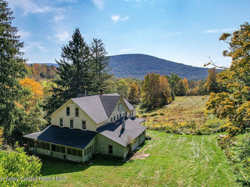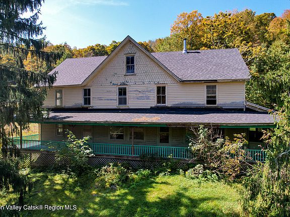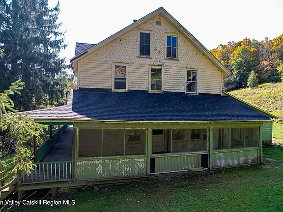 This magnificent property is located in Halcott Center, NY just minutes from Fleischmann's, Restaurants, ever popular Roxbury, Margaretville Hospital and all services, scores of wedding venues, gorgeous hiking trails and the super popular Belleayre Ski complex. Main structure was a vacation boarding house with up to 15 rooms at one time on 2.5 floors. The views from the barn and the house are panoramic with the possibility of more stunning views the higher up the mt that you go. With 59 acres of woodlands and open fields the possibilities are endless. Part of the barn is still standing with the silo in tact but in dire need of renovating. House is 3276 SF and has a new roof and seems to be fairly solid and intact but in need of a gut renovation. Heating systems as as-is (may not be in working order) with oil fed hot air. Front of property follows a babbling stream across the seldom traveled road. A perfect ,beau colic, serene and private location.