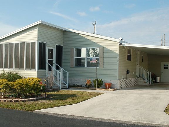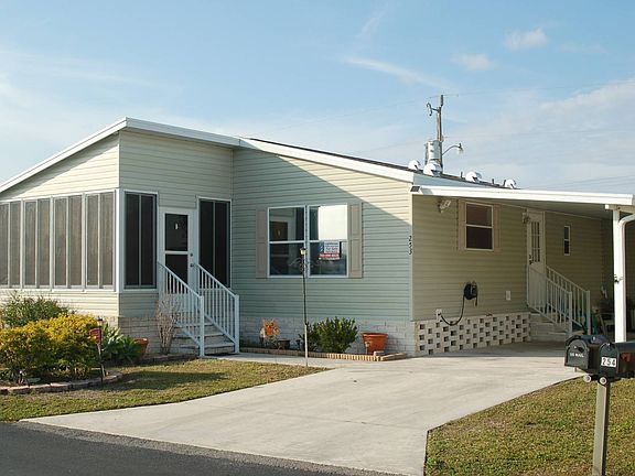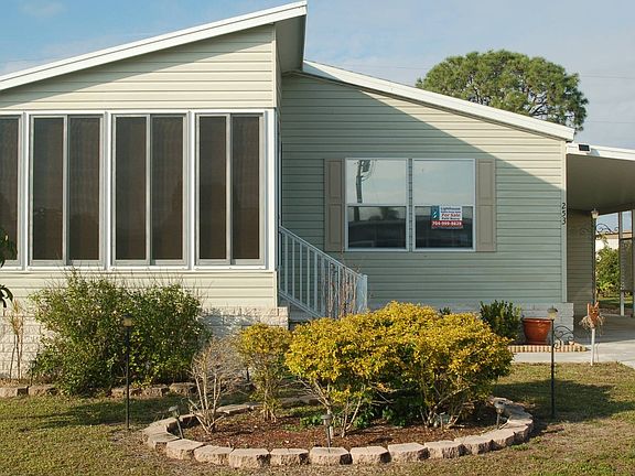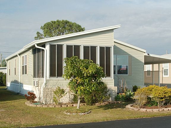 This better than new 2006 3 bedroom/2 bath manufactured home has approximately 1250 square feet, is loaded with upgrades and custom features and as a bonus - comes partially furnished. Throughout the home are beautiful wooden blinds, soaring vaulted ceilings and an open floor plan that will immediately draw you in. The kitchen is sure to delight with the lovely ceramic backsplash, ample white cabinetry, and sprawling counter space. Other new features and upgrades include: new stainless steel sink w/extendable faucet, 3/4 HP garbage disposal, and stainless steel appliances (installed in 2018 that include: side-by-side refrigerator w/in-door ice-maker, dishwasher, and flat surface range with convection oven. The dining area also has a stunning newly installed 3-pendant light fixture. Adjacent to the kitchen and accessible from the carport and guest bath is a spacious laundry/mudroom. Here you will find a new (up-to-date w/building codes) 30 gallon water heater with drain pan and shutoff (installed October 2019), and an LG dryer and washer with drain pan installed in 2016. There is also built-in cabinetry above the washer and dryer and an extra storage closet. The laundry room/hallway/living/dining/kitchen and office have new high quality wood grain laminate (installed 2017). In 2017, the owners installed a gorgeous tropical leaf pattern wooden ceiling fan with light kit in the living room. As a bonus, the owner has decided to leave a 100" oak entertainment center (2 curios w/center storage/TV space that will accommodate a 43" TV). Sliding glass doors lead to an attached 10x12 sun room that was updated in 2017 with an insulated roof, quality dark tinted insulated windows that allows privacy with screens and sun shades, in wall air conditioner and a new exterior door with a window and screen. For pet lovers there is also a doggie door that can be installed. The guest bathroom has a tub/shower combo, light/fan kit, and in 2017 was revamped and includes new elongated toilet, sink faucet, medicine cabinet, and flexible showerhead. Located in the hallway, the thermostat and humidistat were also replaced in 2017. Bedroom 1 is 9x10, carpeted, and includes a TV wall mount. Bedroom 2 is 9x13, has been used as an office and includes an office desktop w/ 3 drawer file cabinet, 4 drawer file cabinet, large closet w/shelving and laminate flooring. The master bedroom is carpeted, very spacious at 12x13, and has an en suite bathroom with walk-in shower w/sliding doors and flexible showerhead. The owners have graciously left a queen size bed, chest of drawers, dresser, and 2 night stands. Outside the home you are sure to appreciate the lattice work that has been installed on the carport for privacy and the automatic security light and electrical outlet that were both installed in 2017. The attached 12x8 storage shed boasts a newly wired workbench, new shop light, and wire shelving that runs across one side of the building. As if that isn't enough, the owners acquired a free-standing 8x10 storage building in 2018 that has shelving already in place and is wired for light. For added peace of mind, the shingled roof was installed 3.5 years ago. There are lovely flower beds at the front and side of the house, new pavers (2018), a rain barrel and a fenced-in area for trash containers. There are also 2 mango trees on the property that are both fruit-producing. All of this for only $585 lot rent per month! Serendipity is an active 55+ manufactured home community with resort-style amenities - heated pool, hot tub/spa, fitness room, tennis, community library, dog park and spacious home sites. The 4,400 square foot clubhouse is always abuzz with dinners, dances, bingo, card games, etc. Your choice, just relax or participate in a wide variety of activities. Convenient to the beach, Einstein/Ford winter estates/museums, and various cultural, ecological and historical attractions. Call Patti to schedule an appointment