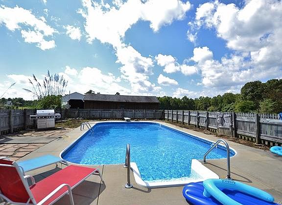 Fabulous Horse property. Fenced pastures. 2 barns. 1 with 2 stalls and tack room, 2nd- 3 stalls and hay storage. In ground swimming pool (Seller states liner +/-2 years old, Pump and filter replaced this summer) , detached 2+ car garage with lean to, electric and 12 ft ceiling.Roof +/- 5 years old Rear handicapped ramp. Shared Paved drive. Custom bar in family room can be purchased for $3500. if not, seller will remove. Seller offering $3,000. closing costs towards carpet and any cosmetics or repairs desired by Purchaser in addition to 1 year home warranty.
