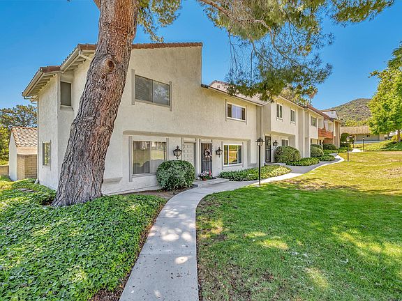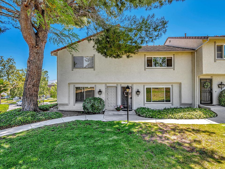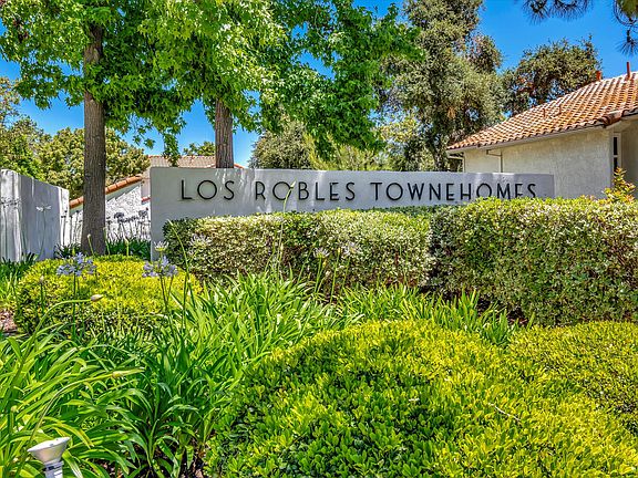Private end unit in the lovely serene Los Robles Town Homes community of Thousand Oaks.. Clean, well maintained, almost 1200 sq ft, town home overlooks a lush, manicured, green lawn area. Close to walking and biking trails. Within minutes to 101 freeway,, major shopping areas, restaurants, golf course, medical offices and Conejo Players Theater. Resort-like complex has 2 pools and a play area for children. Enter through the front door into the living room and adjacent dining area covered in newer, wood-like flooring in a light neutral tone. Half bath downstairs includes a built-in sink and cabinet, newer toilet and newer tile flooring. Kitchen is complete with built-in cabinets, dishwasher, refrigerator, range, microwave and an eat-in area. A washer/dryer is located near the kitchen in an enclosed closet. (Washer, dryer, refrigerator and microwave are provided as a courtesy by the home owner). Upstairs the generous-sized primary bedroom includes a roomy walk-in closet. A large second bedroom with an over-sized closet enclosed with mirrored sliding doors. Full bath located between the 2 upstairs bedrooms has a newer tub/shower combo with sliding doors, newer toilet and tile flooring. Central heating and air-conditioning is provided for the comfort of the resident! One car enclosed garage with roll up door and adjacent to garage is a covered carport. Many guest parking spaces available in close proximity.