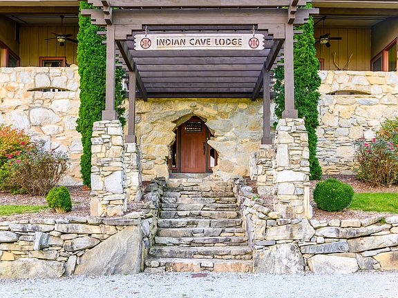 Historic Indian Cave Lodge. Own a piece of history in this awe-inspiring mountain masterpiece encompassing over 2.34 acres with sweeping panoramic mountain views and city light. The lodge is documented as the 1926 training camp for famed heavyweight boxer Jack Dempsey. This lodge style estate boasts open floor plan, 45' catwalks w/ hand forged supports, oak floors, pine planked vaulted ceiling, reclaimed stain glass windows, unique hand carved staircase railing, great room w/ gas fireplace and primitive tile surround, bar/sitting area, kitchen w/ custom oak and walnut cabinetry, granite, open dining area with Tiffany inspired lighting, master suite w/ sitting area, built-in's, His/Her closets and luxurious bath. Upper level features 2 quest rooms (one being ensuite) and office. Lower level boasts natural stone, unique water feature, gorgeous inlayed wood/tile design floor and flex space. Outdoor entertaining options abound with expansive covered veranda and observation deck. This spectacular residence is located minutes to Downtown Hendersonville. Truly an Artistic Masterpiece!