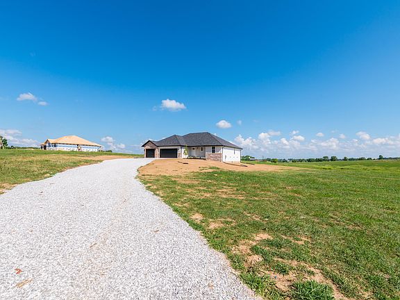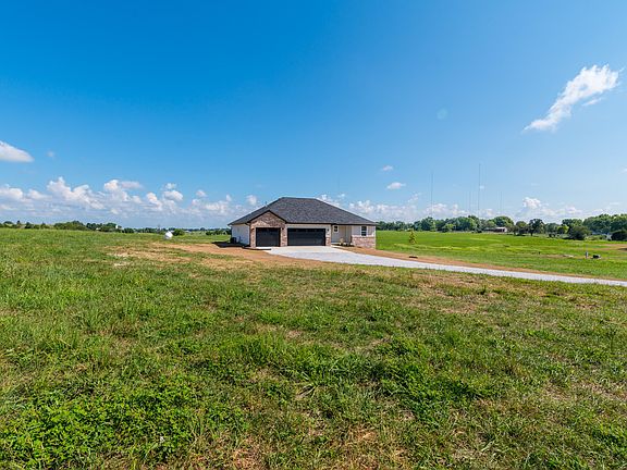 Brand new construction, now completed in Ozark Schools by Linville Construction on 5 acres, more or less. Featuring a covered front porch as you enter, luxury vinyl plank flooring for easy maintenance thru main living and kitchen areas, custom cabinetry w a pantry in the kitchen, granite counters, stainless appliances, a gas stove and a split bedroom floor plan. 4 bedrooms, 2 full baths, and a 3 car garage. The large master bedroom has a barn door entry to the en suite and you can enjoy a soaking tub, separate tile shower, double sinks and a large master closet. This house on 5 acres is located at the EE/Highlandville exit off of Hwy 65, an easy commute into town or to Branson and Tablerock Lake! Watch the wildlife from your covered back deck or build a shop building to store the boat or toys! The yard will be seeded with a front landscape package. A shared two party well is planned right now and a septic system, a propane tank for gas will be leased and Liberty Electric is the provider for electricity. No HOA dues but there will be restrictive covenants recorded at closing time, your agent can provide those for you, they are available. Inside those covenants, you can build an outbuilding and have animals.