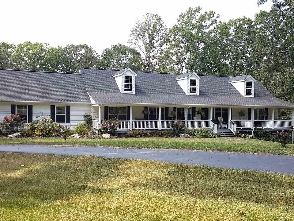 A ride through the picturesque wooded landscape is the perfect Welcome Home. This practically new single level ranch home is nestled on a lot that is over 3 1/2 acres of privacy, framed with a 72 foot rocking chair porch big enough for social gatherings. Open the front door to hardwood floors in the living and dining areas and a large eat in kitchen with breakfast island, solid surface counters and stainless appliances. The owner''s bedroom suite is spacious enough for a king bed and the ensuite bath has a separate garden tub and shower, dual vanity, and a wrap around walk through closet. A floored attic, in-ground pool, amazing back porch living space and storage barn complete the package.