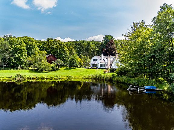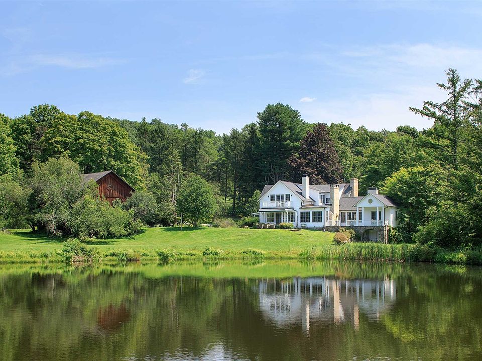 On a peaceful lane in the heart of the Hudson Valley, this delightful 64 acre retreat creates a story-book setting for country living. The magical homestead opens with a light-filled colonial farmhouse updated with every amenity and features beautifully patinaed wide-plank pine floors, hand hewn beams, sconce lighting, and custom cabinetry at every turn. The living room and dining room, both with fireplaces, invite gatherings. The sun-lit French-style kitchen with chef's appliances, center-island with second sink; and family room with fireplace, wall of windows and French doors open to an entertaining terrace overlooking a sparkling swimming pond with dock. A barn-beamed sitting room with fireplace and wall of custom cabinetry; guest suite with French doors the terrace, and a screened-in summer porch for al fresco entertaining are added highlights. Upstairs, the gabled master suite with fireplace, private sitting balcony, spa bath with mosaic tile shower, soaking tub and dual vanity; is complemented with an additional two ensuite bedrooms (one with a fireplace). Outside, a set to the side Adirondack-style fenced garden has a wisteria draped pergola, mature apple trees, raised bed vegetable and flower boxes, and a chicken coop. Past the picture-perfect Dutch barn, and set back into the woodlands, a rustic guest house with deck overlooking the lake has three bedrooms and baths, and a full basketball court. The ideal country setting to escape. Whole housw generator is an added bonus. The wonderful Hudson Valley offers vineyards, parks, walking trails/Rail Trail, antique shops, cozy cafes and culinary-grade restaurants. 15mins to the Villages of Millbrook and Rhinebeck and 90 mins to NYC. Please be sure to view property tour. Must see to appreciate. Appointment required to view, notice appreciated.