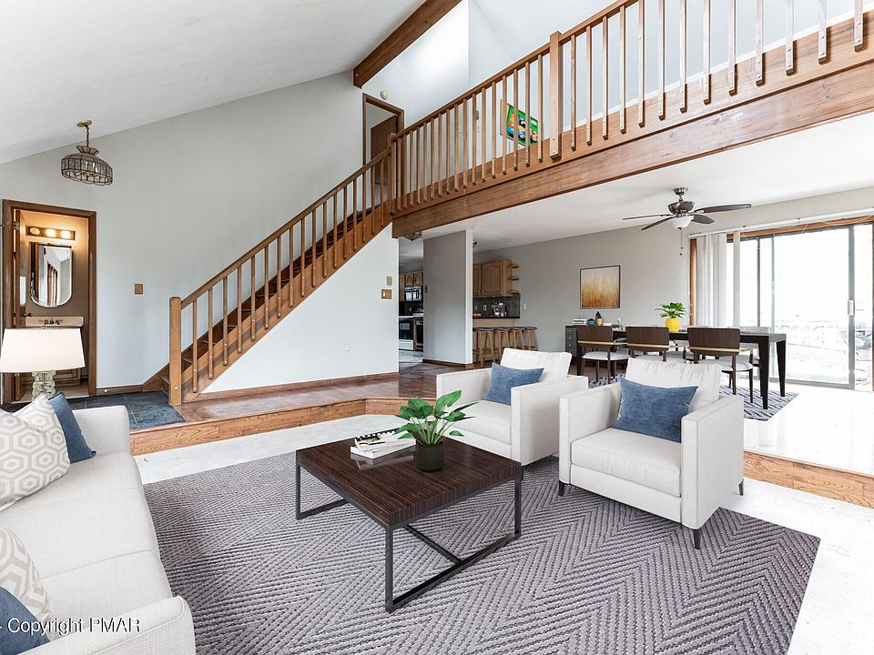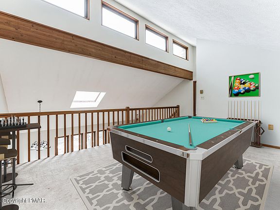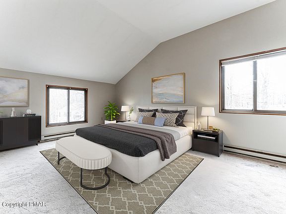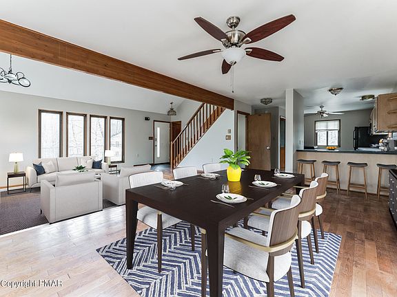 Welcome home! This 4 bed, 2.5 bath, 2,256 sqft has with plenty of space to entertain and relax in the Poconos! As you enter the home, you'll immediately notice the high ceilings with a loft and the abundance of natural sunlight throughout the first floor open layout. The kitchen has plenty of storage and the laundry area. There is another bedroom behind the kitchen on the first floor and the half bath is located by the front door for easy access when entertaining. Upstairs, you'll find the loft and large primary bedroom/en suite with a walk in closet. Downstairs, you'll find a family room, 2 bedrooms, and another full bathroom. Amenity filled community with pool, security, lake, beach, tennis, basketball, volleyball and a restaurant.