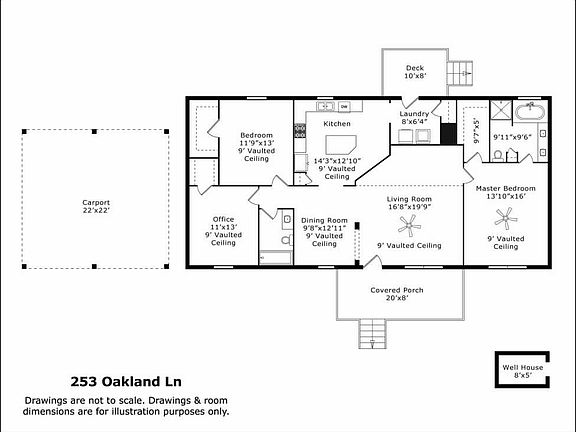 - Rooms: Dining Room, Kitchen, Bedroom 2, Master Bedroom, Office, Carport, Living Room, Laundry, Covered Porch/Patio