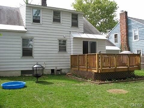 Welcome home! This beautiful three bedroom, home in Eastwood features a good-sized, sun-filled kitchen with a breakfast bar and lots of storage, as well as a sliding glass door for ease of entrance to enjoy your deck and fully fenced backyard. Separate dining area adjacent to the kitchen with room for a larger gathering. One first floor bedroom and full bathroom with new tile surround and glass block window to let in more light. Additional room upstairs, features two large bedrooms with a crawl space attic for plenty of storage, and a bonus half bath at the top of the stairs. Hardwood and ceramic tile flooring downstairs, carpet on the stairs and upstairs. The interior of this house has been freshly painted and feels very bright and clean, and the roof is brand new!