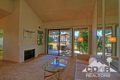 Great Location and Amazing Views from this wonderful elevated 30 Plan end unit - 3 Bedrooms, 2 Baths located on a cul-de-sac. This condo is only a short walk or golf cart ride to the clubhouse. The silhouette of the Santa Rosa Mountains will take your breath away. The Living Room has a soaring ceiling and cozy fireplace all looking out onto the golf course. Beautiful kitchen is light and bright. Two car garage with direct access has built-ins for additional storage. Monterey Country Club offers a 27 hole championship golf course, tennis, fitness center, a beautiful clubhouse and over 30 community pools and spas. Conveniently located near all the desert's best theaters, shopping, restaurants and more! Offered Furnished. A must on your tour of fine homes.
