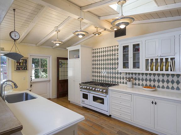 In an enchanting Montecito neighborhood, a private lane opens to reveal, a rose-bowered, single story country home. Remodeled in 2000, this 3 bedroom, 2.5 bath home with media room and detached cottage, includes a gourmet kitchen, decadent master suite, sandstone fireplaces and a separate dining room. The dreamy grounds include oak trees, fruit trees, rose gardens, outdoor kitchen and fireplace