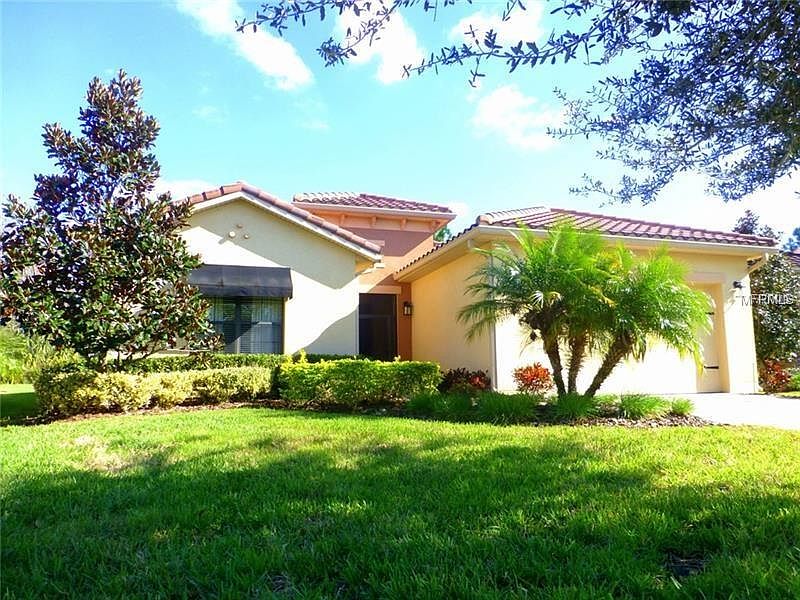 This IMMACULATE SANIBEL model is located on a serene CONSERVATION lot. OPEN CONCEPT home with 12' ceilings & TRANSOM windows in the main living area. The kitchen features STAINLESS STEEL appliances (NEWER Microwave & Dishwasher), center ISLAND, recessed lights, UNDER & OVER mounted CABINET lighting, 42" UPPER Cabinets with crown molding & PULL OUT drawers in lower cabinets. HUGE walk-in PANTRY. LARGE CERAMIC TILE throughout the main living area & bathrooms. 8' Doors, ROUNDED CORNERS on the walls & high baseboards are great upgrades. The MASTER bedroom is a spacious retreat (20' x 14') featuring a sliding glass door opening to a generous sized COVERED & SCREENED LANAI (40' x 10'). Two ample WALK-IN CLOSETS. Master bath boasts DUAL SINKS, custom mirrors & a walk in shower. Energy efficient DUAL PANE WINDOWS & DOORS. Long lasting BARREL TILE ROOF. Upgraded LIGHTING. SCREENED front PORCH. 2 car garage. 2 minutes from the PALMS Amenity Center (with resort type pool, pickleball, tennis & fitness center). Put this one on your MUST SEE list. Watch FULL LENGTH VIDEO on Tour Link (video camera icon).