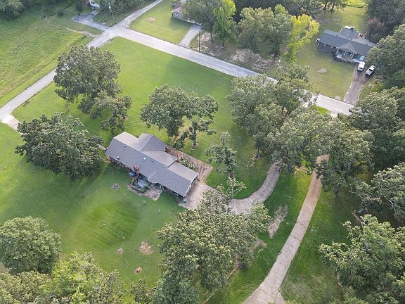 Nice brick house sitting on 2 acres, Double Garage with small step up into main living area, featuring 3 bedrooms 2 baths on main level 2055 SqFt Living Room, Den with Gas log fireplace, Kitchen with all appliances, stone counter tops, Dining Room, Utility Room, Mud Room Front Porch, rear Deck and a nice size BASEMENT: with 650 SqFt Den/Game room Second Kitchen with appliances, Bathroom and Dining area. Roof was replaced in 2022, and Central Unit in 2023, 24' x 32' Shop Building (needs some repairs)