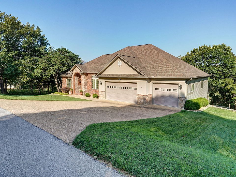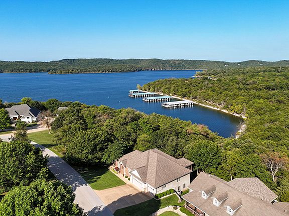 Amazing, finished walkout basement home in a semi-secluded setting is on LAKEFRONT with a 10 x 24 boat slip available. Overlook Subdivision separates itself from most - offering many amenities including in-ground pool, clubhouse, long-term trailer & boat parking, community water system, as well as excellent HOA and POA structure. The exterior of the home offers a fantastic blend of planned landscaping and Table Rock Lakes natural beauty. Beginning with sharp curb appeal concrete & pebble driveway, brick - stone - and touch of stucco front, covered front porch, low E gas windows with UV protectant, front sprinkler system, wide 3 car garage (with attached extra insulation, shelving, tub sink, & workbench), and groomed front yard. The rear exterior is an oasis - hosting nearly 21 species of birds, deer families, resident bat that reduces mosquitos, excellent shoreline fishing, mature trees, clear pathway to shoreline for easy access, large & terraced limestone boulders, remarkable composite covered & open deck - so nice, covered & open expanded patio. Spending time in the back yard is worth visiting the property - so relaxing. The inside is meticulous in the owner's care. This easy keep home offers so many options regarding rooms & living spaces.... the main level offers a wide & inviting entryway (with raised ceilings and crown molding), formal dining area (with well-kept engineered wood floors, coffer ceilings, & crown molding), large living room (with archways, see-through gas fireplace with stone & wood mantel, crown molding, dimmable lighting, excellent flow to open kitchen & dining / sunroom), cozy sunroom (with fantastic view of seclusion complete with lakeview, fireplace, and a real sense of peace). The open kitchen & dining (with triple & transom windows for lakeview, easy access to covered deck, black & stainless appliances, trash compactor, black composite sink with lakeview, granite countertops, granite island...